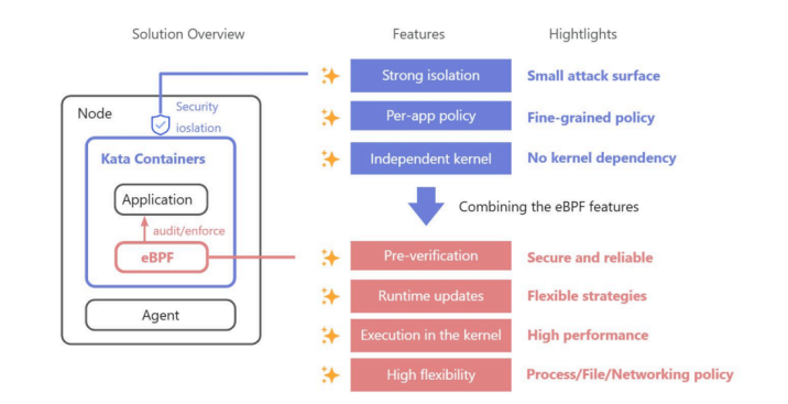 - A node-level security agent delivers policies to Kata Pods, loads eBPF programs into VM kernels, and collects logs through eBPF channels. This architecture decouples security enforcement from the host kernel, enabling flexible and application-specific policies without cluster-wide disruption.